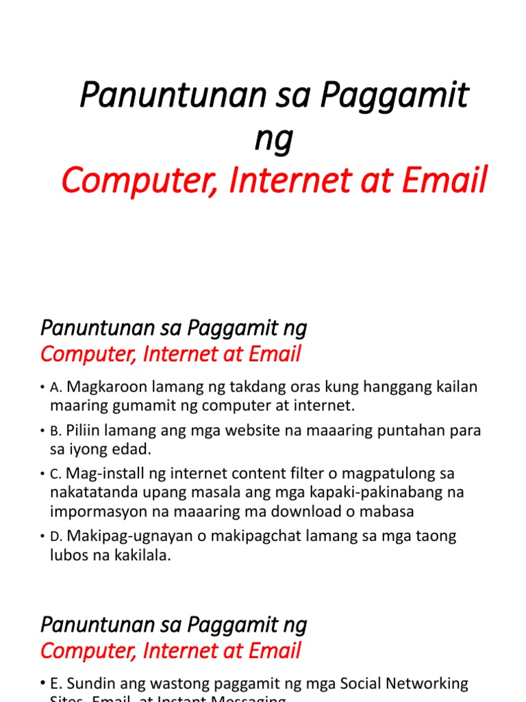 Pagtakda ng tama at limitadong oras sa paggamit ng internet. Pagyamanin Kasanayan sa Ligtas at Responsableng Paggamit ng Computer Internet at Email 1. Mga Gabay para sa Kasiya-siya at Responsableng Paggamit ng Internet Makibahagi sa talakayan tungkol sa mga gabay para sa ligtas at responsableng paggamit ng internet.