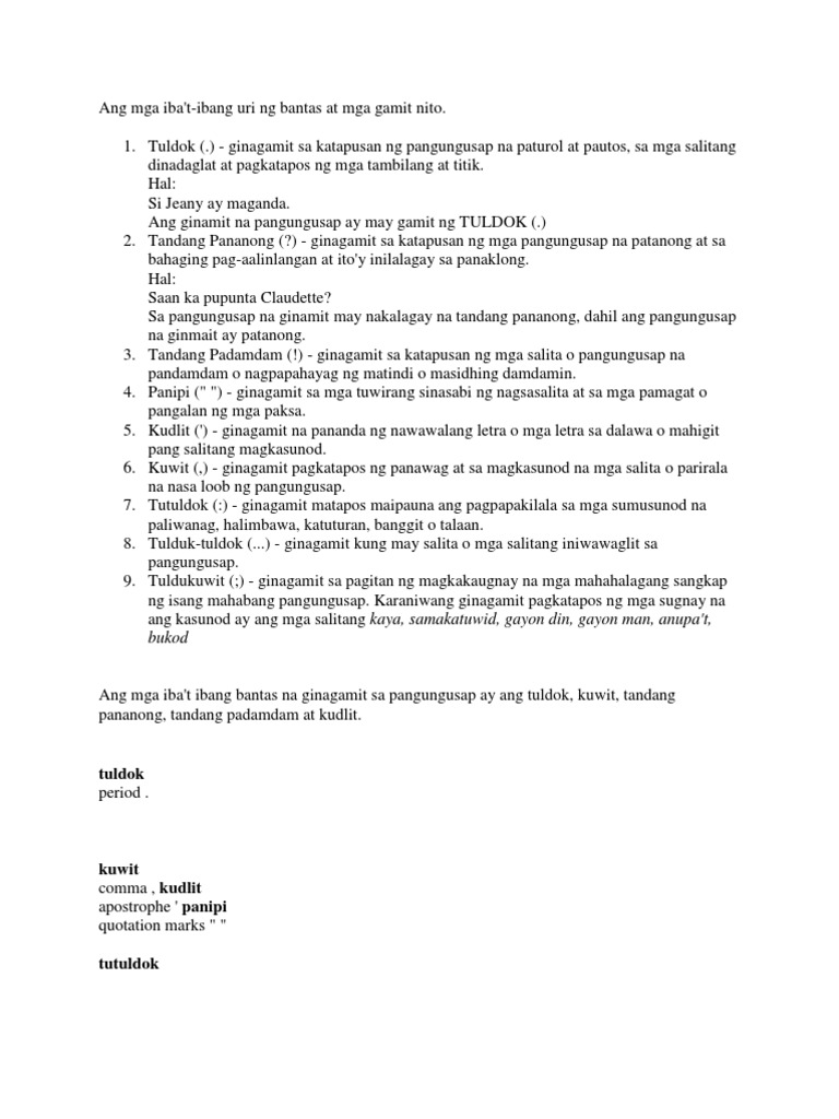 The student is asked to rewrite the sentence on the blank with the appropriate punctuation marks. Some of the worksheets for this concept are Pagsasanay sa filipino Pagsasanay sa filipino Gamit ng malaking titik work grade 2 Filipino baitang 2 ikatlong markahan Kahalagahan ng wastong bantas Kahalagahan ng wastong bantas 195 Mga uri ng bantas work work. SAN JOSE CITY NATIONAL HIGH SCHOOL SENIOR HIGH SCHOOL Batid halos ng lahat na ang social media ang kadalasanh ginagamit ng mga tao upang makipag komunikasyon sa ibang tao sa wastong pag gamit ng mga bantas mas mauunawan ng taong kausap ang ninanais mong ipabatid at upang maiwasan ang hindi pagkakaintindihan.