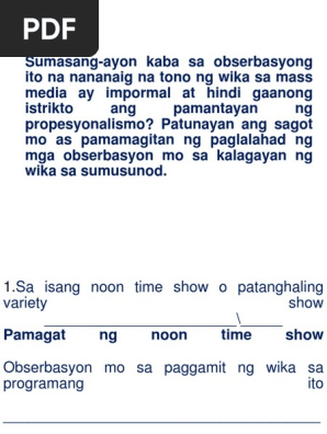 1Sa isang noon time show o patanghaling variety show __________ Pamagat ng noon time show. Obserbasyon mo sa paggamit ng wika sa programang ito. Madalas na Filipino ang ginagamit nila na wika kung ang pangyayari ay napapaloob lamang sa ating bansa at English naman kung ang balita ay naganap sa labas ng bansa.