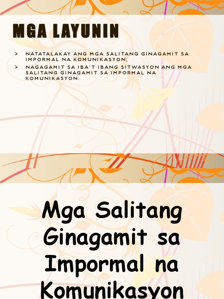 Mga salitang ginagamit sa impormal na komunikasyon. Mga Salitang Ginagamit sa Impormal na Komunikasyon 2. Mga Salitang Ginagamit sa Impormal na Komunikasyon 1.