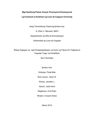Ano kaya ang internet at social media. Kahalagahan ng Facebook sa Lipunan. Isa sa mabuting epekto ng paggamit ng wikang ingles ay para maging mas handa ang mga mag-aaral sa globalisasyon at pagtrabaho.